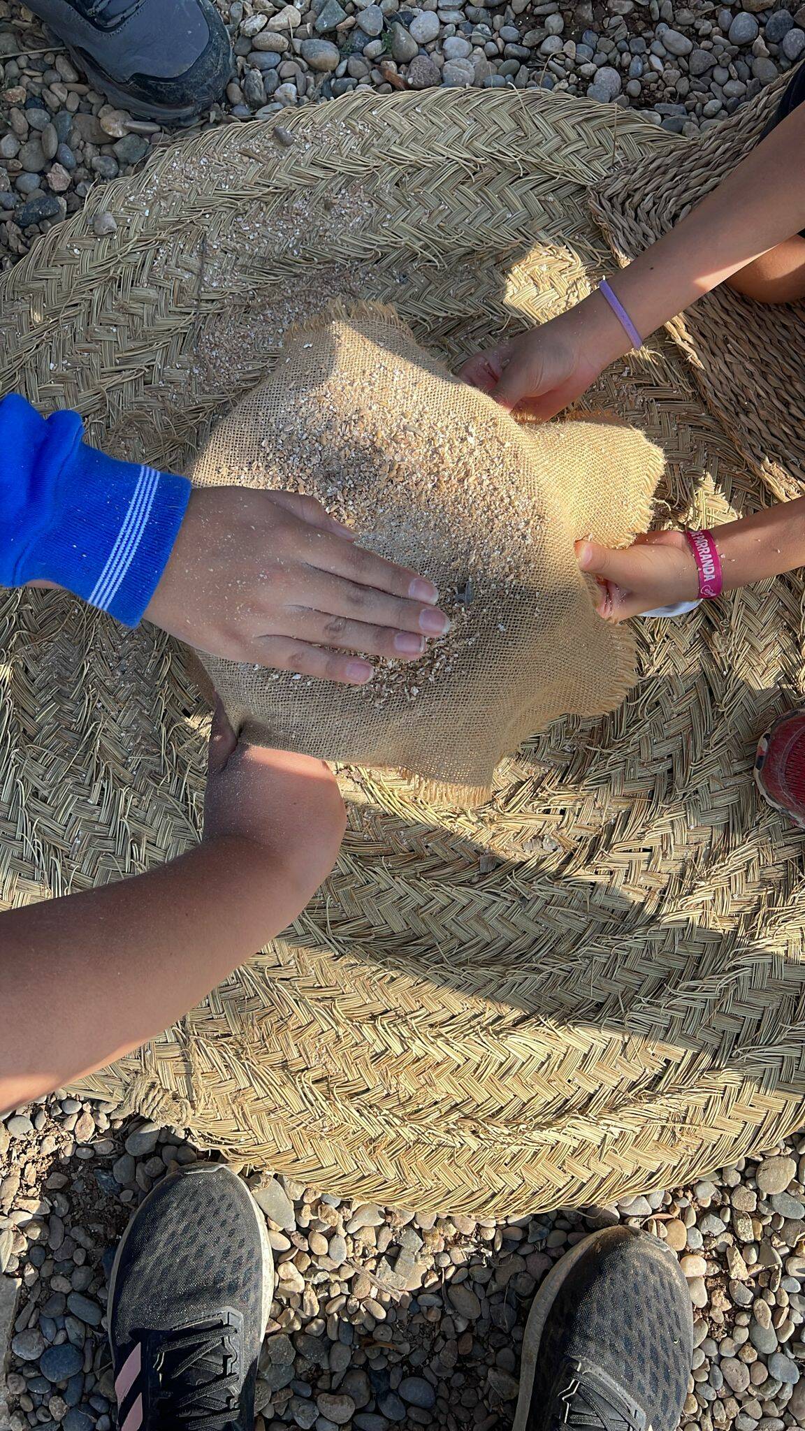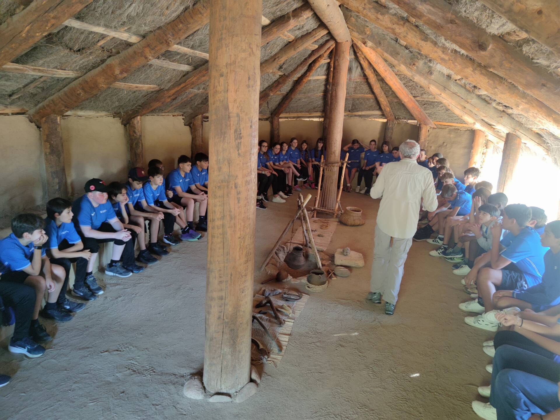 Els nois i noies s’han apropat de manera vivencial a la vida quotidiana d’un poblat neolític. A través d’un joc d’observació i comparació, han treballat el concepte de canvi i continuïtat en la història, identificant eines i objectes actuals que conserven la mateixa funció que els del neolític. També han experimentat algunes de les feines de l’època, com la mòlta de blat per obtenir farina o la creació d’ornaments amb materials naturals.