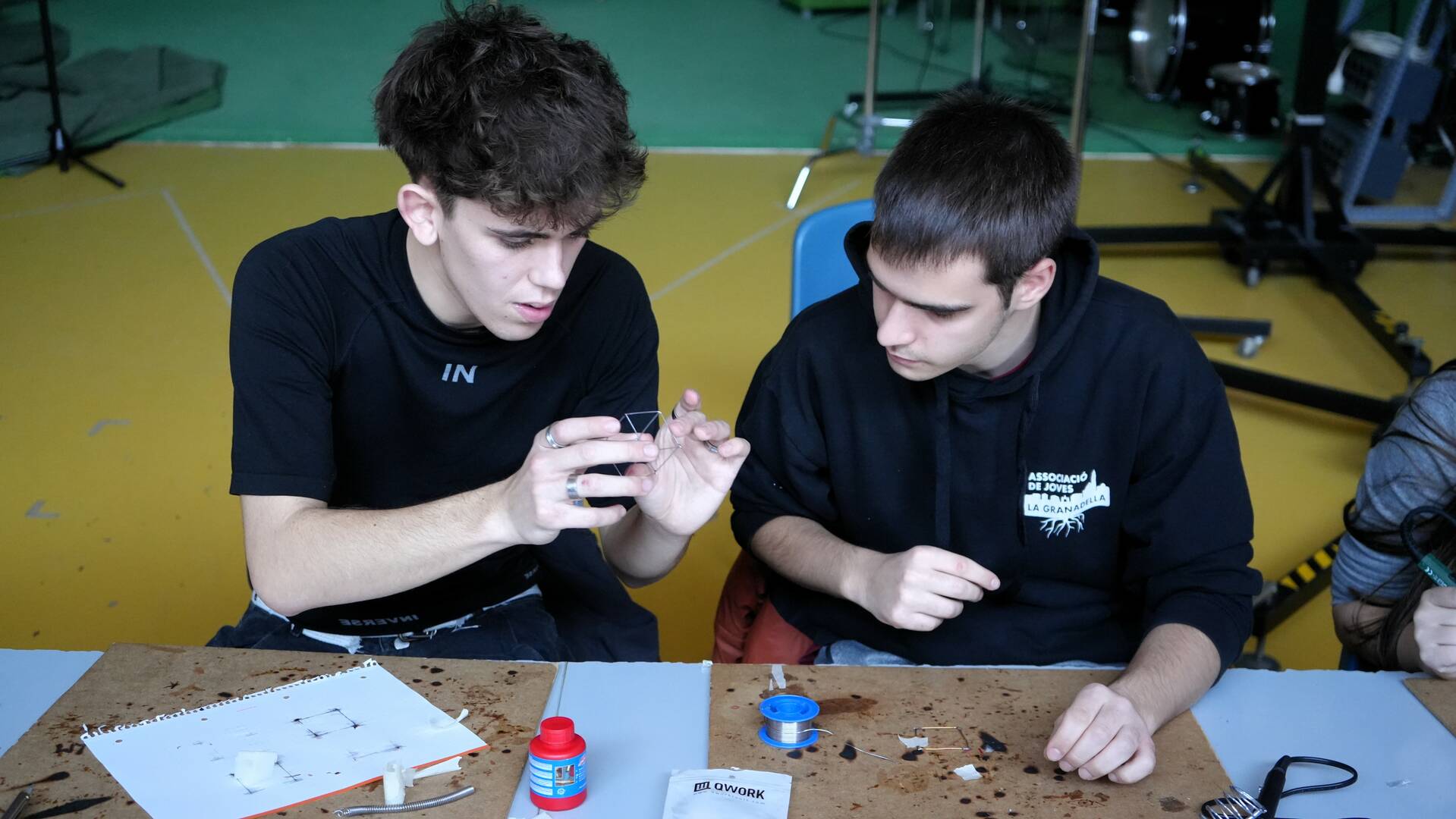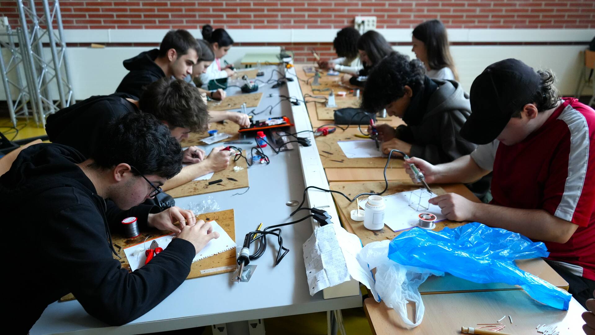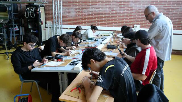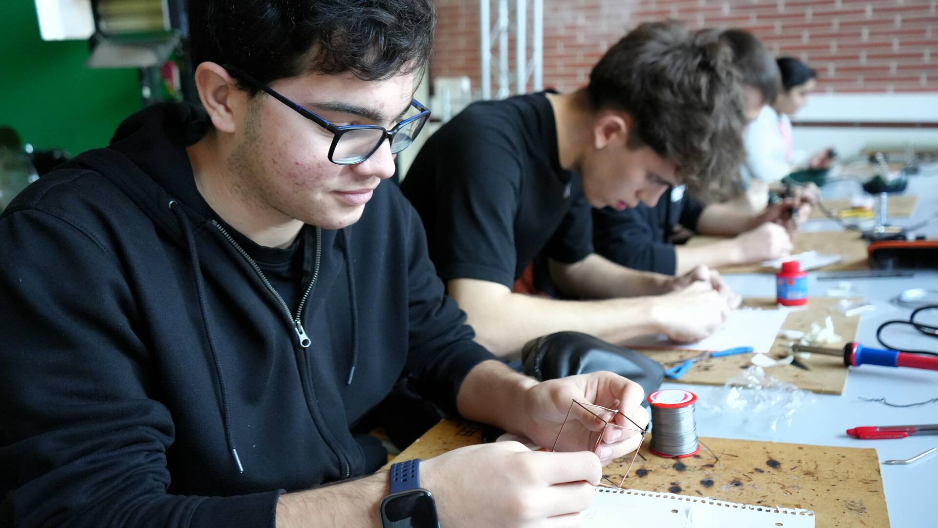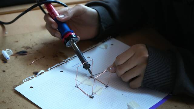 L’alumnat de 1r del CFGM de Vídeo, discjòquei i so realitza pràctiques de soldadura en el mòdul: Muntatge i instal·lació d’equips de so. Els nois i noies creen figures geomètriques per agafar destresa amb el soldador i aprendre a ser polits i precisos amb les unions metàl·liques. També ho practiquen creant una escultura lliure. Després apliquen la tècnica de soldar a la fabricació i reparació de cablejat d’àudio.