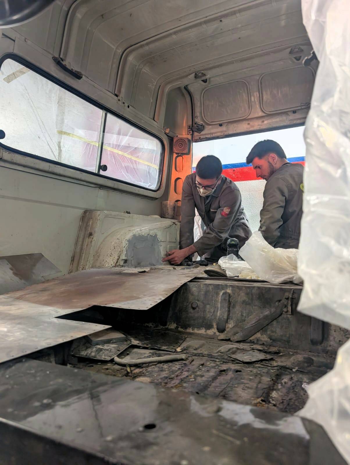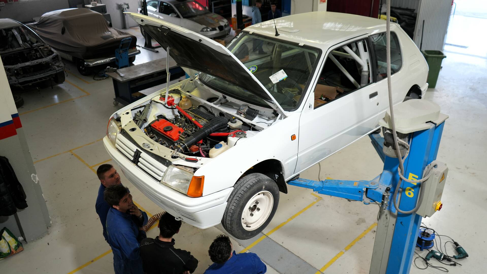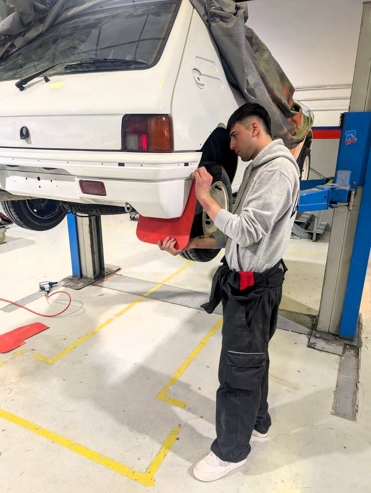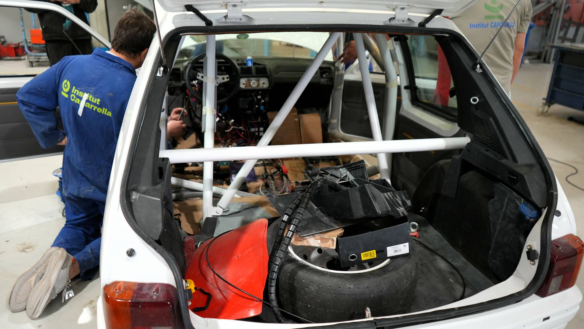L’alumnat de 2n del CFGS d’Automoció continua en el mòdul de projecte intermodular el procés de restauració d’un vehicle de competició Peugeot 205 Rallye. En les darreres setmanes els estudiants han treballat adaptant-ne els pedals per a competició. També han instal·lat el cablejat per a l’extinció d’incendis i la desconnexió elèctrica del cotxe. A més a més, han pintat l’interior amb Robliner tintable, conegut també com «Raptor», simulant el color de la moqueta vermella original.