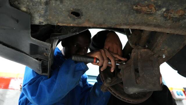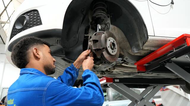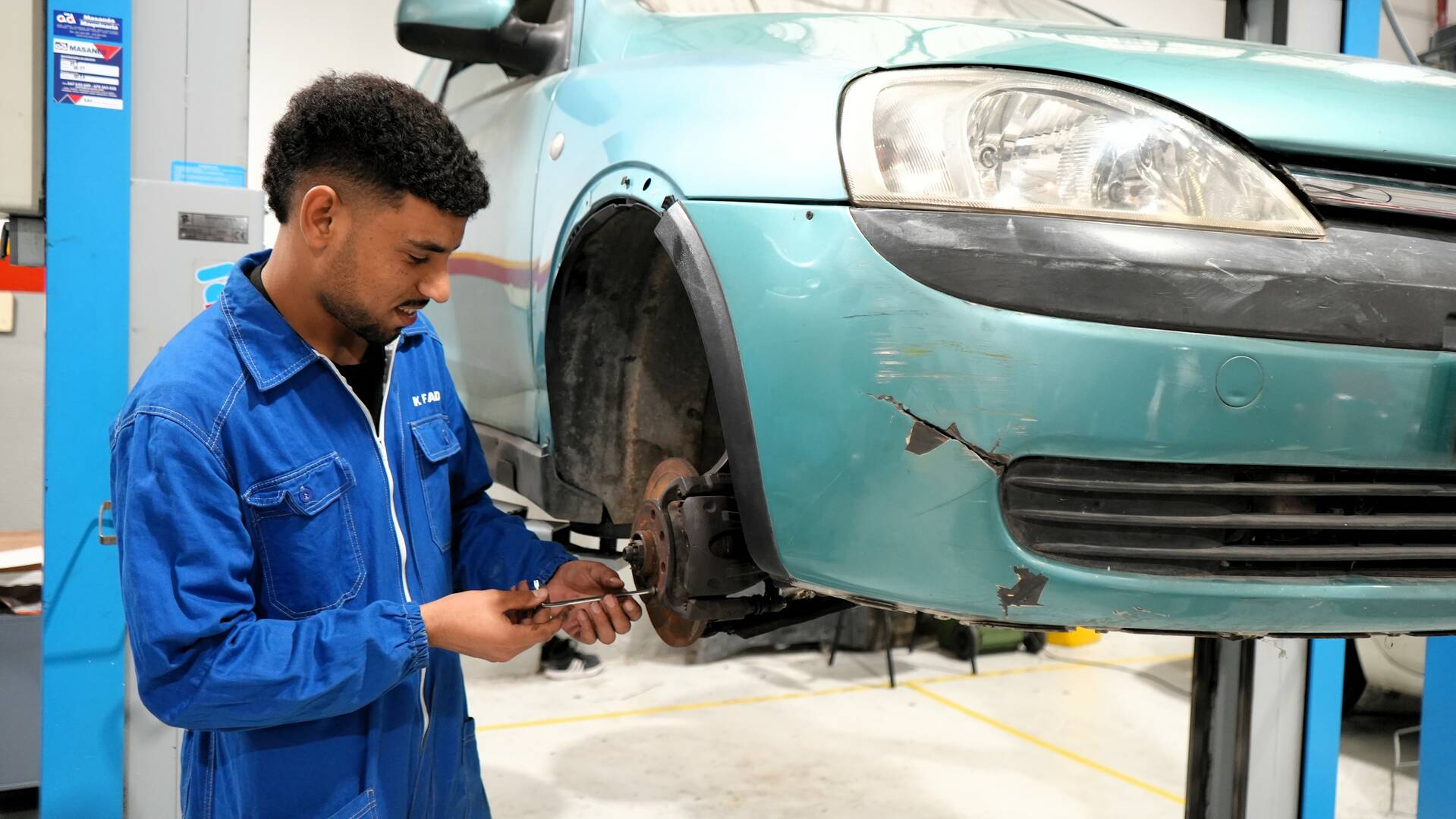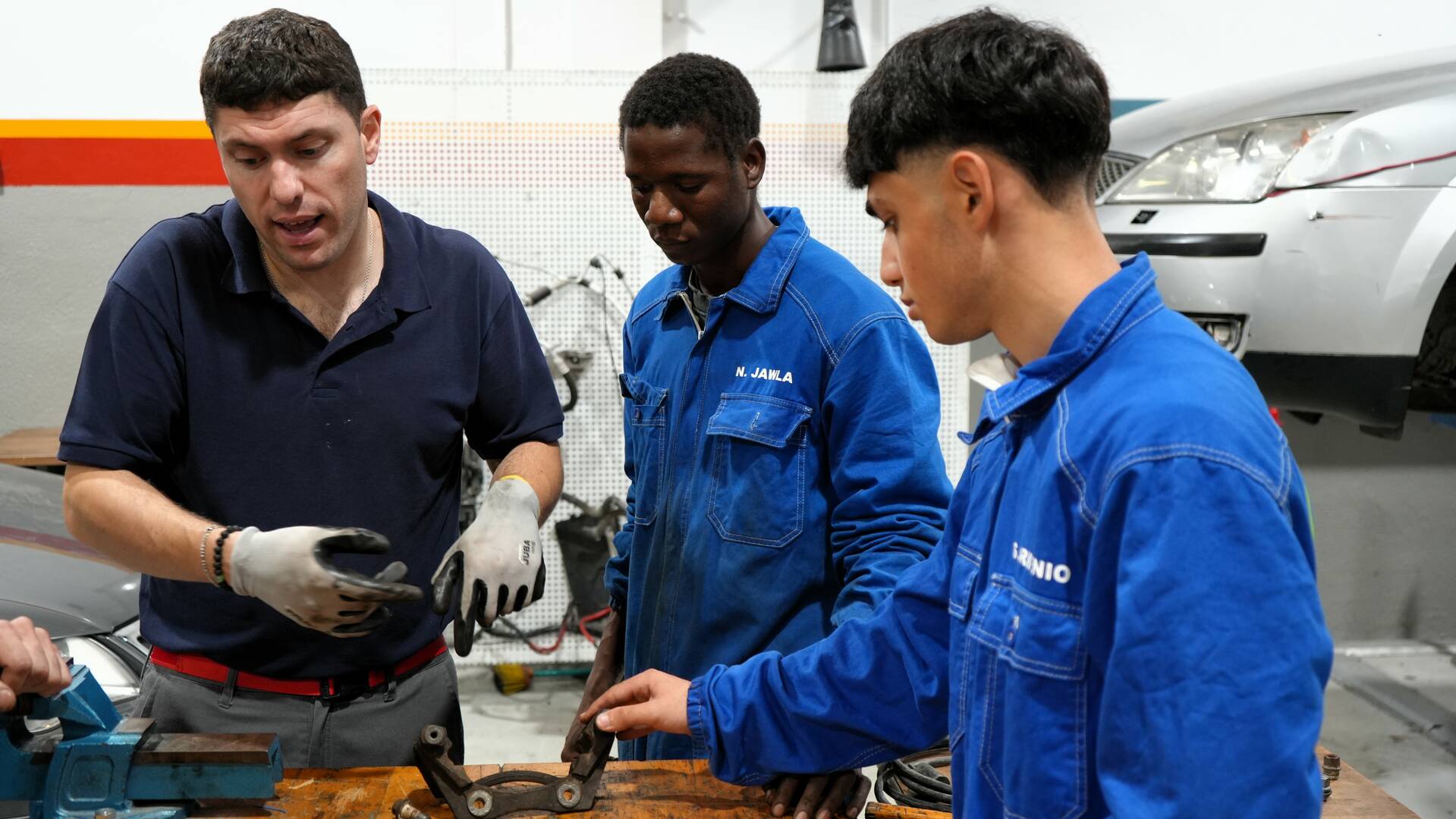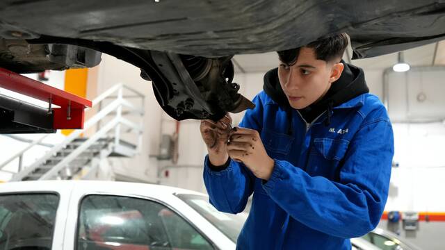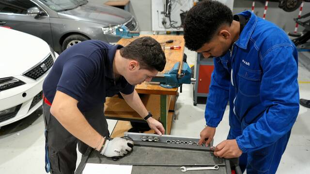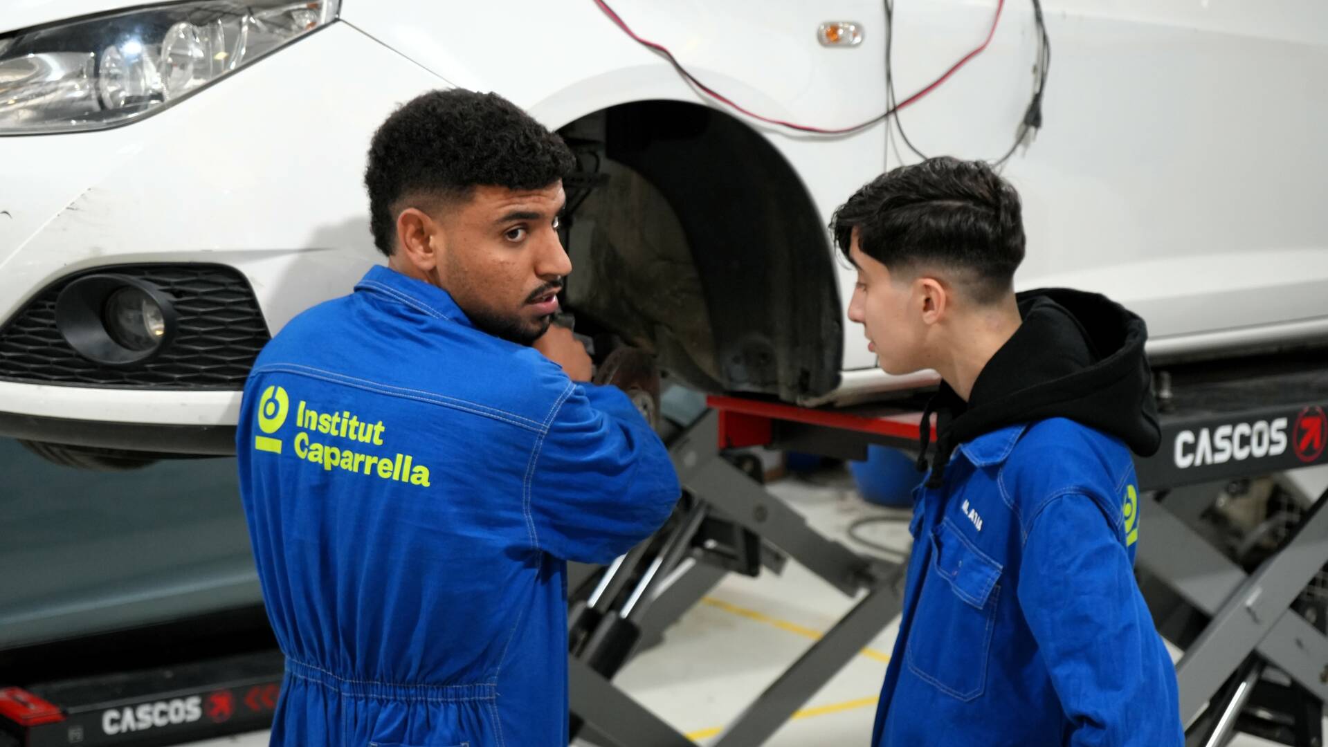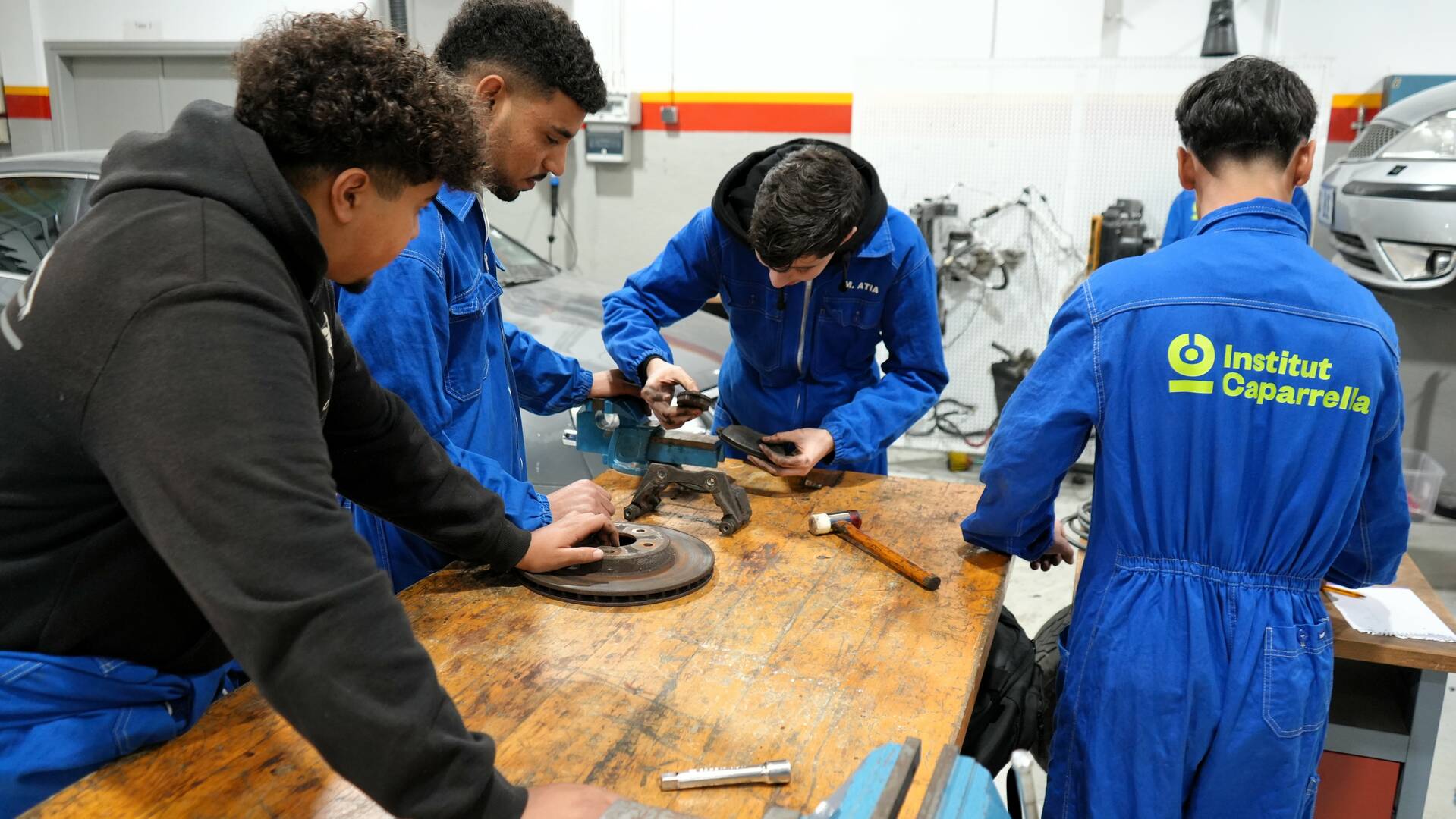 L’alumnat de 2n del CFGM d’Electromecànica de vehicles automòbils realitza exercicis d’identificació de l’estat i de components i de manteniment del sistema de frens d’un cotxe. Aquesta pràctica s’emmarca en el mòdul de projecte intermodular, en què també duen a terme altres pràctiques sobre altres parts del vehicle com les rodes, la direcció, la suspensió, etc.