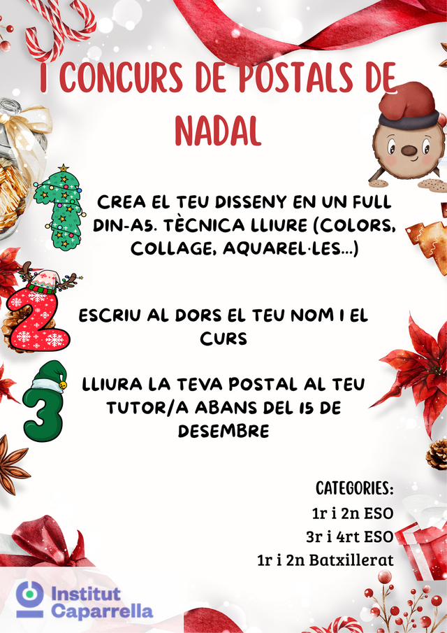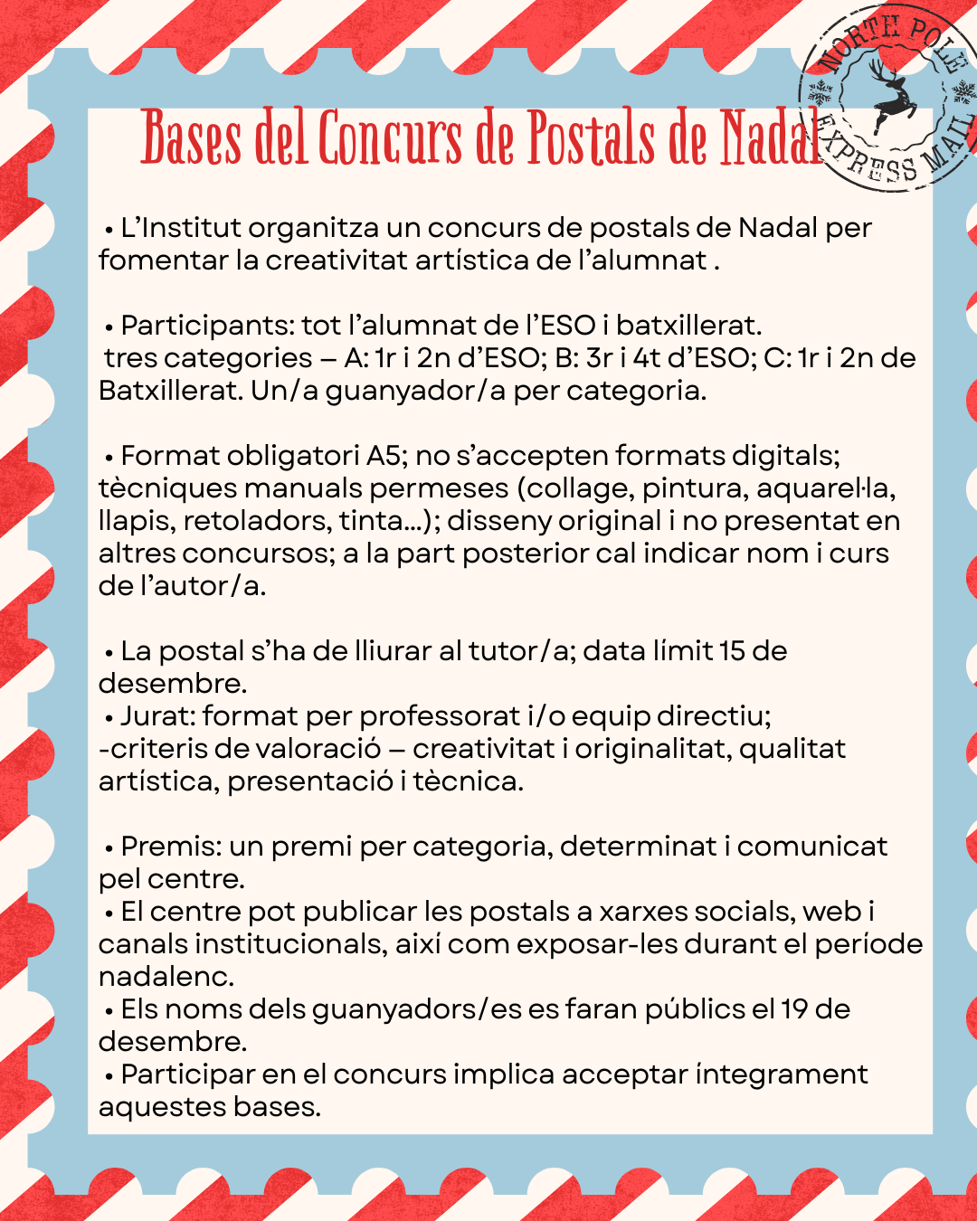 L’Institut organitza el Primer Concurs de Postals de Nadal obert a tot l’alumnat d’ESO i Batxillerat. Us animem a participar-hi i a compartir la vostra creativitat, imaginació i esperit nadalenc.
