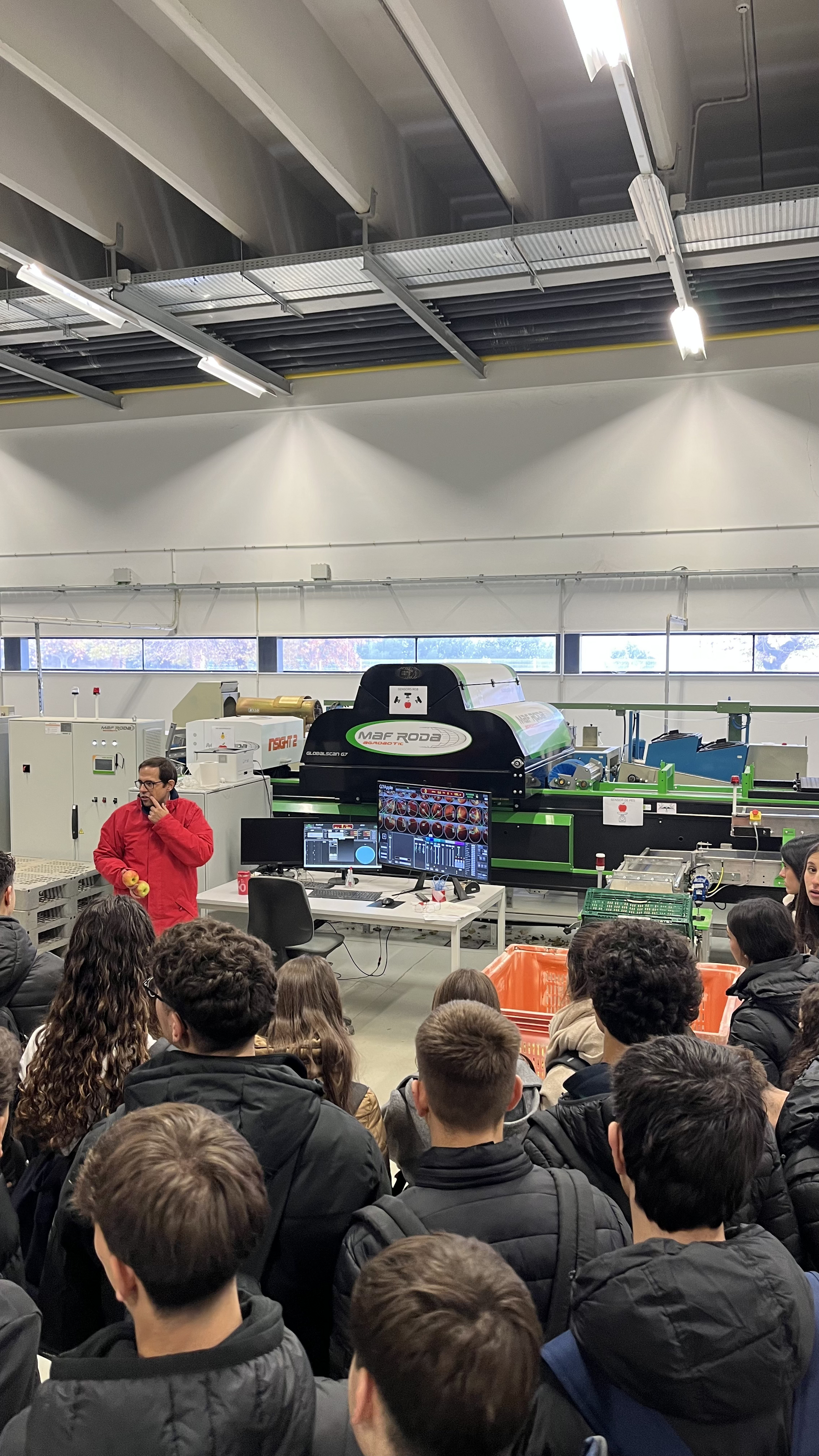 Posteriorment, els estudiants van visitar el FRUITCENTRE, un centre de recerca i desenvolupament (R+D) de l’IRTA dedicat a la innovació en tota la cadena de valor de la fruita. Les instal·lacions, que ocupen un edifici de 6.500 m², inclouen planta pilot, càmeres de conservació, laboratori de recerca i sala de tast, entre d’altres.