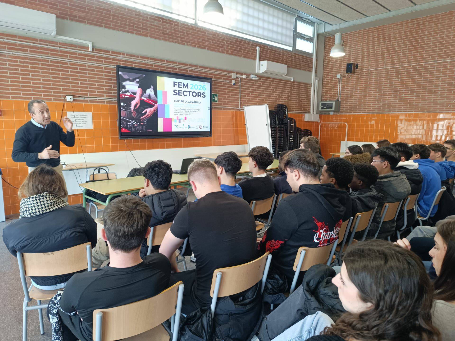 El passat divendres 13 de març ha tingut lloc a l’institut una xerrada de la iniciativa #FemSectors de la COELL, la confederació d’organitzacions empresarials de Lleida. Estava adreçada a alumnat de 4t ESO, i GFPB, per ajudar-los a orientar el seu futur professional i ha comptat amb la participació de professionals dels sectors del'Automoció, l’hostaleria i turisme, el metall, la mobilitat i la construcció, que han compartit la seva experiència formativa i empresarial amb els joves. Així, han explicat en què consisteixen les seves professions: Salvador Trabalon (Restaurant Saroa), Carlos Teixiné (Teixiné Automoció), Josep Mayoral (Grup Nayox) i Xavier Roselló (Sorigué).